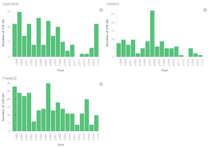 If you have something with very very few CVE IDs it doesn’t mean it’s secure, it means nobody is looking for security issues. It’s easy to understand that if something is used by a large diverse set of users, it will get more bug reports (some of which will be security bugs) and it will get more security attention from both good guys and bad guys because it’s a bigger target. If something has very few users, it’s quite likely there hasn’t been a lot of security attention paid to it. I suspect what the above graphs really mean is Free BSD is more popular than OpenBSD, which is more popular than NetBSD. Random internet searches seem to back this up.